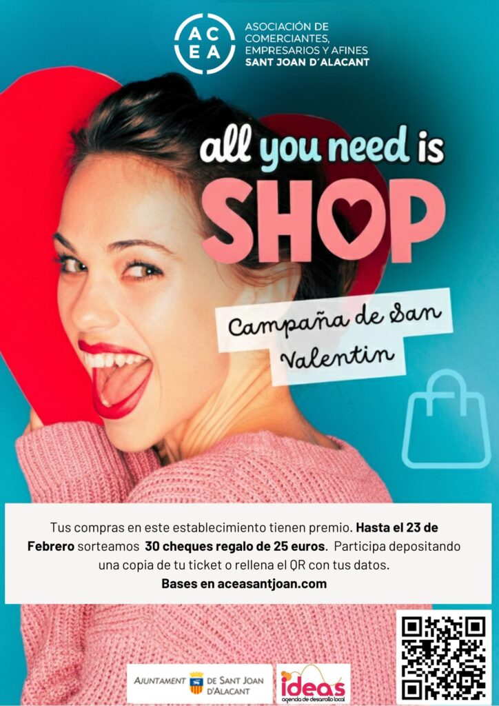 Durante el mes de Febrero tendrá lugar la campaña ALL YOU NEED IS SHOP consistente en un sorteo de 30 cheques de 25 euros para realizar compras en el comercio asociado. Para participar solo será necesario escribir tus datos en una copia del ticket de compra y entregarlo al establecimiento adherido a la promoción o escanear el QR del cartel publicitario. Las bases del sorteo serán las siguientes.