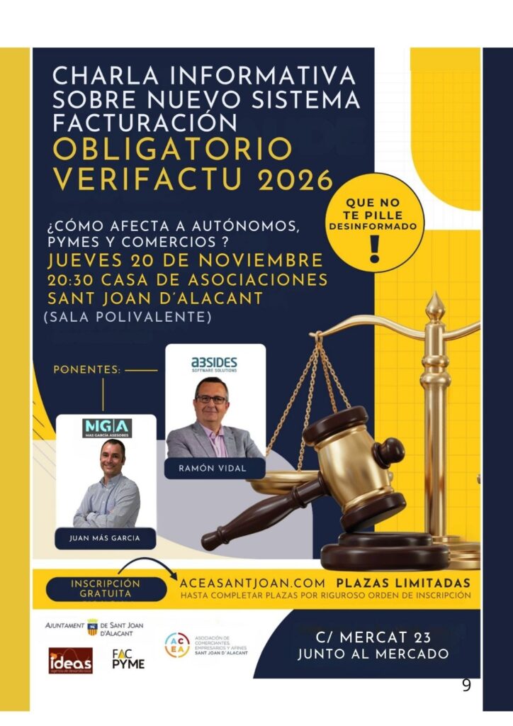 El próximo jueves 20 de noviembre a las 20.30 en la Casa de las Asociaciones (C/ Mercat 23, junto al nuevo mercado) realizaremos conjuntamente con la Concejalía de Comercio una charla sobre VERIFACTU el nuevo sistema obligatorio de facturación para empresas y autónomos que entrará en vigor en enero del próximo año.
